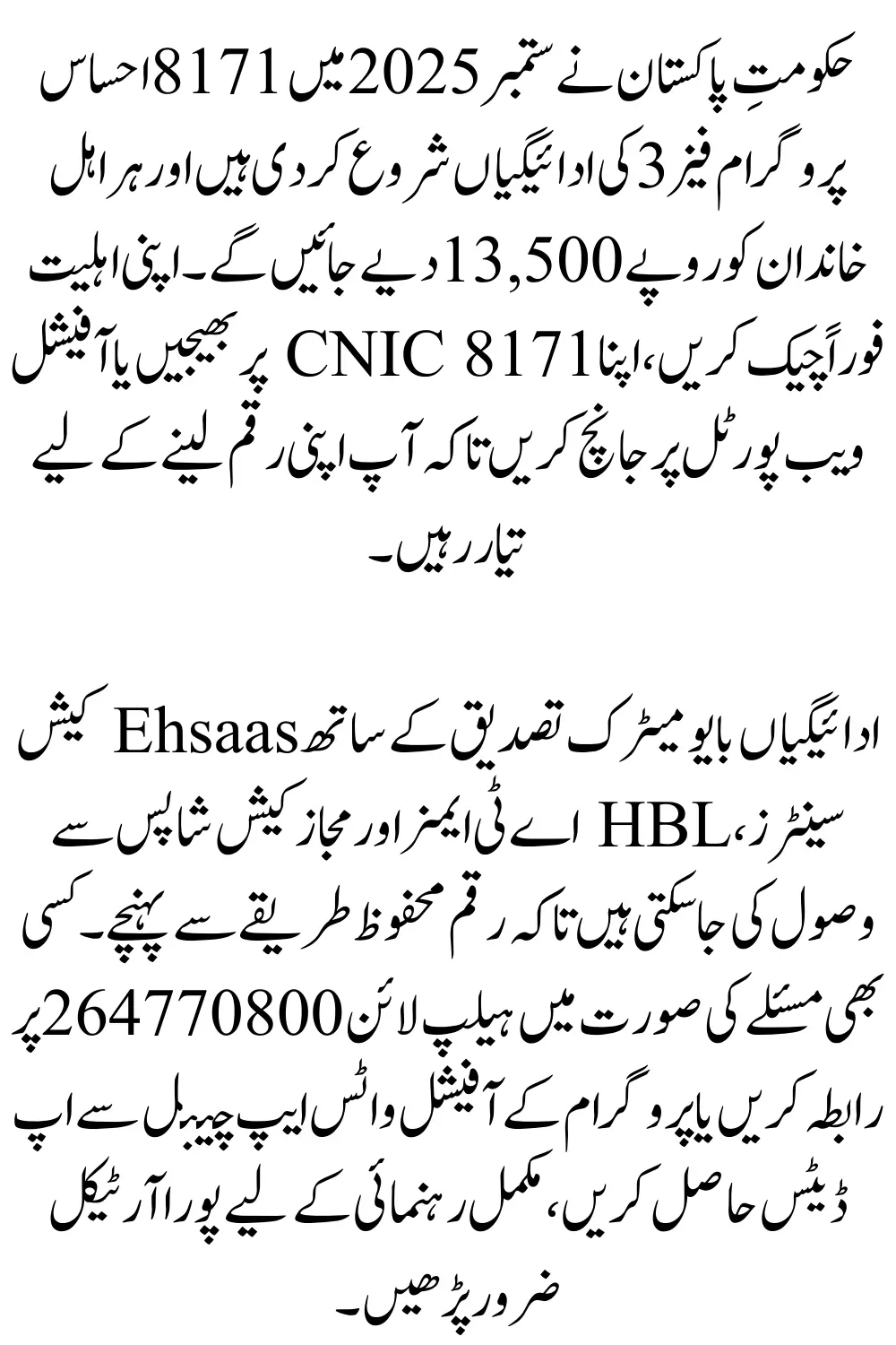 The Government of Pakistan has started the 8171 Ehsaas Program Phase 3 Payments in September 2026. Each eligible family will get Rs. 13,500. To check your eligibility immediately, send your CNIC to 8171 or visit the official web portal. The payment will be available at Ehsaas Cash Centers, HBL ATMs and authorized cash shops with biometric authentication.