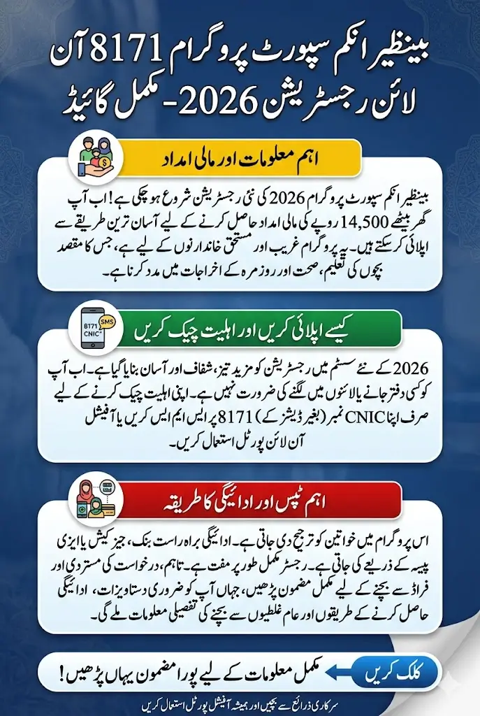 BISP 8171 Online Registration 2026 is now easier than ever, allowing eligible families in Pakistan to apply for financial assistance rs. 14500 from home. You can quickly check your eligibility by sending your CNIC to 8171 or using the official online portal. No more long lines or office visits just simple, fast registration. The Benazir Income Support Programme prioritizes women and ensures transparent payments through banks, JazzCash, and Easypaisa. Make sure to submit accurate details and avoid scams by using official channels only. Apply today to receive support for education, healthcare, and daily expenses.
