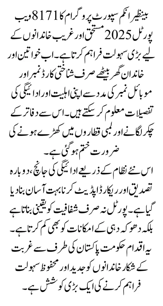 The BISP 8171 Web Portal 2026 is a significant step towards providing financial aid in a modern and transparent manner. With new features like CNIC verification, payment tracking, re-verification, and eligibility checking, families can now manage the entire process from home.