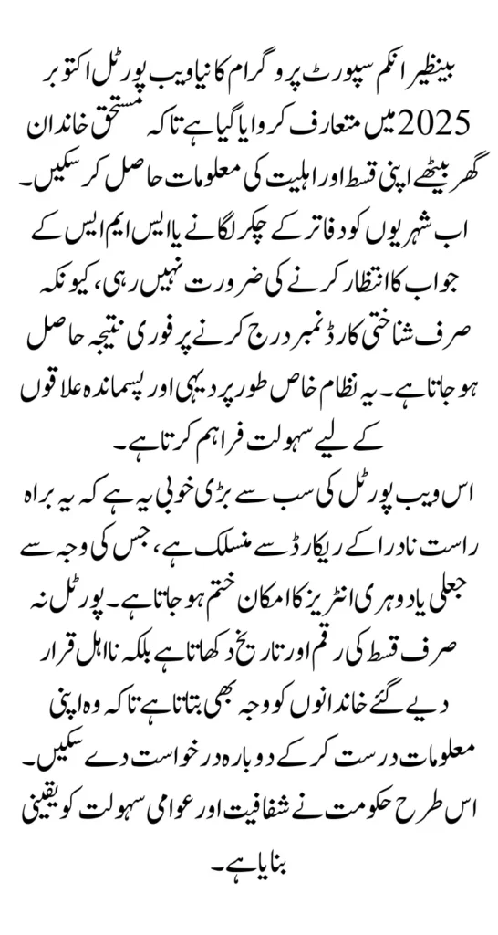 The most important feature of this upgrade is its direct connection with NADRA’s database. This integration ensures that CNIC numbers are verified instantly and that only genuine beneficiaries are displayed in the results. It eliminates fake records, reduces delays, and provides a clearer view of each family’s financial assistance history. Whether you want to know the release date of your October 2025 instalment or check if your family is still eligible, the portal now gives accurate information without any hassle.