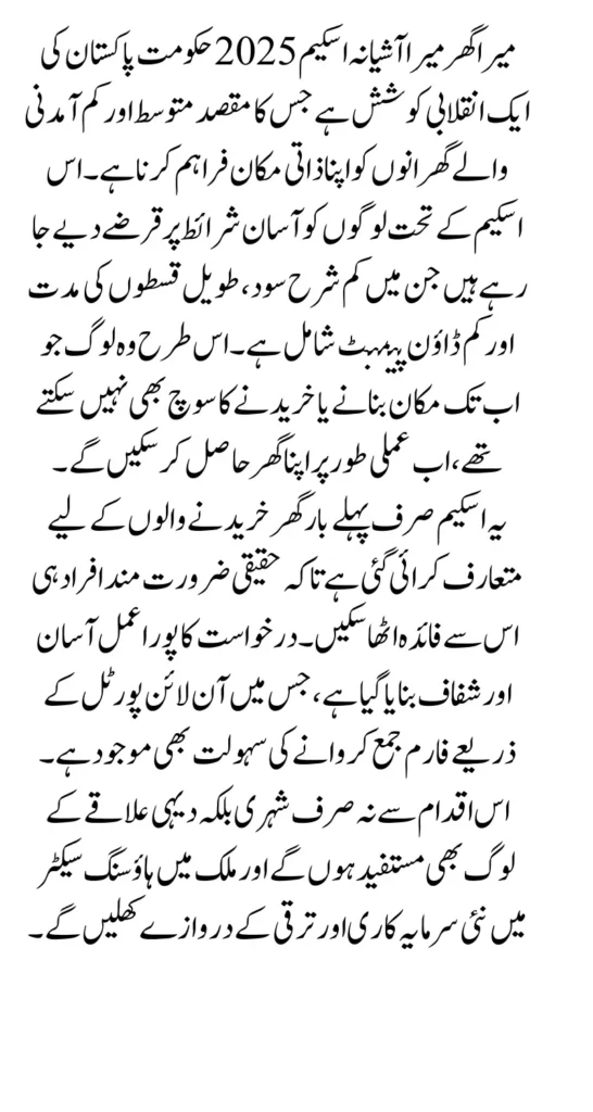 Mera Ghar Mera Ashiana Scheme Owning a home is the biggest dream of every family, but for many low and middle-income households in Pakistan, this dream always feels out of reach. The Government of Pakistan, in collaboration with the State Bank of Pakistan (SBP), has launched the Mera Ghar Mera Ashiana Scheme 2026 to make this dream possible. This housing finance scheme offers affordable loans with low markup, small down payments, and long repayment options, ensuring that even those with limited income can buy or build their first home.