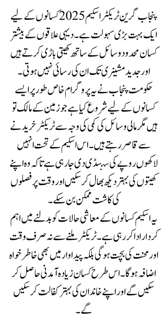 The Green Tractor Scheme is not only about providing tractors; it is about strengthening the entire agricultural system of Punjab. By giving access to modern technology, the government ensures that farmers can cultivate their land efficiently and at the right time.